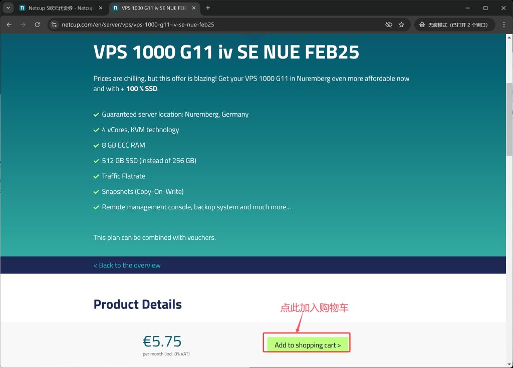 首先打开以下链接:https://www.netcup.com/en/checkout/cart      输入新人5欧元立减无门槛,点击Redeem即可加入购物车了。