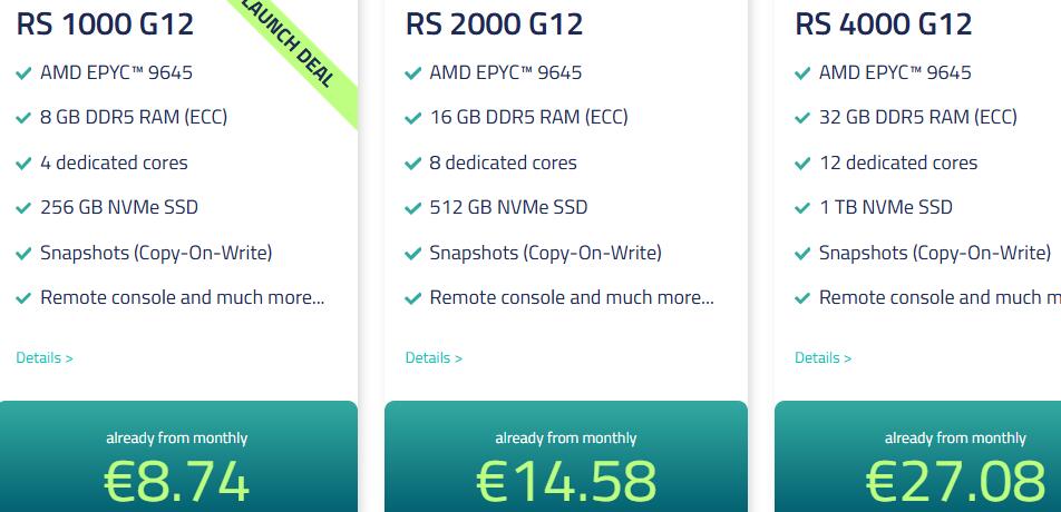 RS 1000 G12 作为netcup旗下最受欢迎的产品,其最新G12代CPU升级为AMD EPYC 9645处理器,4个独占的CPU核心,远远超过一些E3、E5的独服,搭配8G的DDR5高速内存和256GB的NVMe 固态硬盘,2.5gbps的带宽也可以提供高速的连接。但价格仅仅只需要8.74欧/月,直接成为了现今VPS里独一档的存在,没有任何一款能够在性价比上超过它,远远领先其它主机商。使用上述优惠券时,您可以以优惠2个月的价格得到RS1000G12,无疑性价比爆棚。
